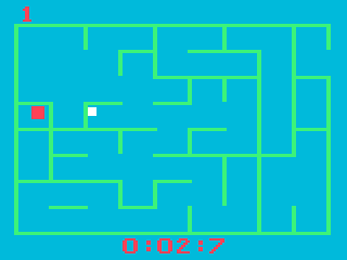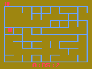 A Labyrinth Game revolves around navigating a pawn from the left side of a shifting maze to an exit on the right. Each play session consists of ten consecutive rounds, and every new game generates a fresh labyrinth layout. Players steer their pawn with the joystick and can hold down the action button to dash through corridors, adding a layer of risk and reward as you decide when speed outweighs caution.