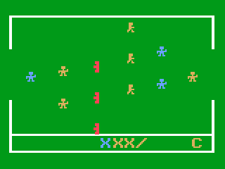Ball physics are refreshingly straightforward: if a moving foosman intercepts the ball, it comes to a halt; if it strikes an unmoving one, it rebounds. This predictable behavior invites players to develop defensive trapping tactics as well as explosive counterattacks. Scoring is displayed with slashes (/) for single points and X’s for two-point blasts, and the contest concludes when someone racks up ten points (represented as “XXXXX”). The tension builds with each tally on the scoreboard, driving you to perfect timing and precision.