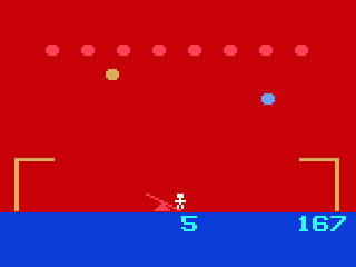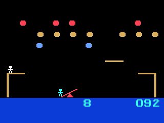 The animated teeter board and shield elements add a layer of visual clarity, making it easy to judge landing distances and shield positions. While primitive by modern standards, the color palette feels deliberately nostalgic. The balloons glide in a smooth back-and-forth motion, offering enough kinetic appeal to hold your attention despite the limited on-screen detail.