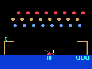 Visually, P.T. Barnum’s Acrobats! embraces a vibrant, retro arcade style. The three colored balloon rows—blue, yellow, and red—are vividly drawn against a stark black backdrop, ensuring each pop is instantly gratifying. The acrobats themselves sport simple but charming sprites, their cartoonish frames leaping and tumbling fluidly over the teeter board.