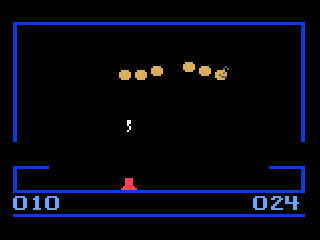 Graphically, Sid the Spellbinder! draws upon the Atari 2600’s palette to deliver simple but effective visuals. The playfield is clear and uncluttered: Sid’s segmented body is rendered in solid contrasting colors that stand out against the dark, starry backdrop. Each segment is distinctly shaped, making targets easy to identify even during fast-paced moments. The straightforward design ensures that gameplay remains the focus.