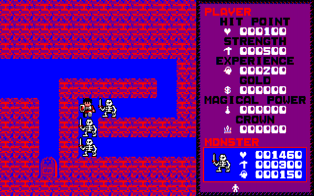 Dragon Slayer’s graphics epitomize early 8-bit charm, featuring crisp sprites and a straightforward color palette. The overhead view provides clear visibility of your character, enemies, and dungeon layouts, ensuring you can make split-second decisions during heated skirmishes. While simplistic by modern standards, each tile and sprite is distinct enough to convey vital information at a glance.