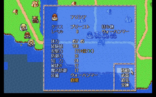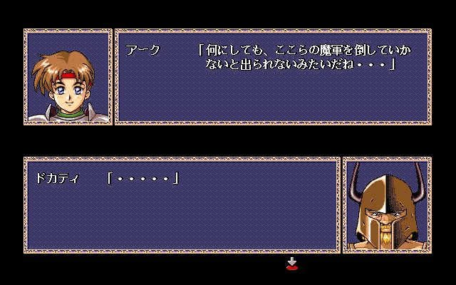 Graphically, Farland Story Denki: Arc Ō no Ensei closely echoes the pixel-art charm of the original Farland Story, but with more vibrant color palettes and refined character sprites. The world map is richly detailed, featuring hand-painted backgrounds that bring towns, forests, and dungeons to life. Subtle animations—swaying trees, rippling water, flickering torches—add atmosphere without overwhelming the strategic focus.