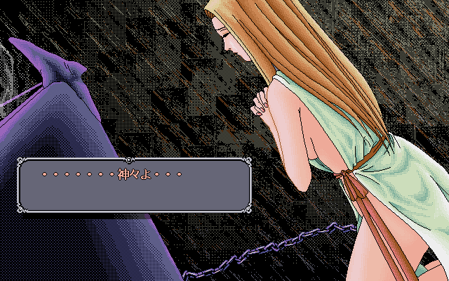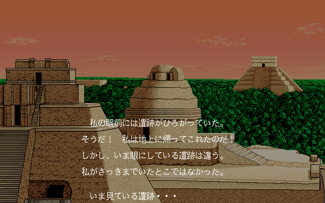The narrative of Ikenie: Kyōraku no Shinden is deliberately cryptic, offering just enough context to pique curiosity without fully explaining the hero’s origins. We know only that he is a modern young man who, after an intimate encounter with a mysterious woman, finds himself transported to a colossal, Aztec-style temple. This disorienting setup establishes an immediate “fish out of water” tension.