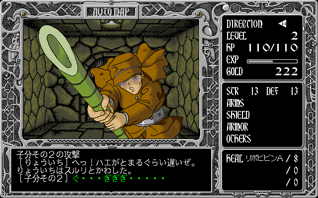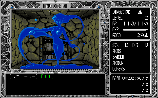 Combat encounters appear randomly, and the system is deliberately simple. You choose between “Attack” or “Run Away,” and victories grant automatic experience points—no grinding menus, no complex skill trees. This stripped‐down approach keeps the pace brisk, but it also means battles can grow monotonous if you’re seeking deep tactical options. Outside of fights, you can use healing items at will, and shops sprinkled throughout the dungeon let you purchase weapons, armor and consumables. Gear upgrades are straightforward: weapons increase your attack, armor boosts defense—nothing more complicated than equipping the best items you can afford.