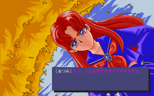 The visual presentation of Meikyū Gakuensai leans into early‐era JRPG aesthetics. Corridor walls, floor textures and doorways are rendered in simple 3D, while character portraits and event illustrations appear as detailed 2D drawings. The contrast between the stark, grid‐based dungeons and the lush event art helps highlight key story moments—especially when revealing the game’s more mature content. Enemies are depicted with clear, bold sprites that read well against the background, making combat encounters easy to follow.