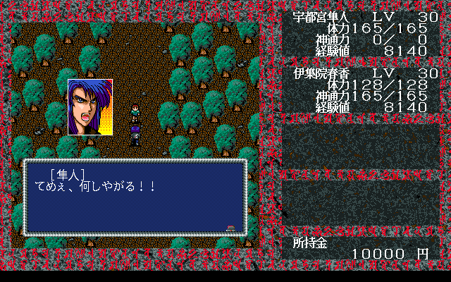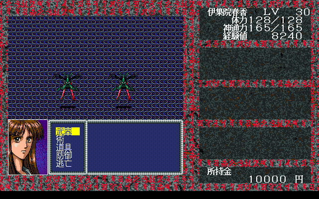Shiki Oni no Koku: Chūgokuhen – Daiyonshō delivers a classic “light” Japanese-style RPG experience reminiscent of Compile’s earlier titles. Players guide a party of up to four characters through maze-like, top-down dungeons, where each step can reveal hidden corridors, secret rooms, or wandering demons. The sense of discovery is heightened by the visible enemy sprites on the map — contact triggers first-person, turn-based battles that demand careful positioning and strategic spellcasting.