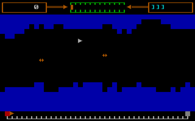 In Attack On Altair, the galaxy is in trouble and it’s up to you to save it! The game is an action side-scrolling shooter which uses ASCII characters to create 16-color “graphics.” From the very first level, you’ll pilot your starfighter through waves of enemy drones, capital ships, and environmental hazards, all while dodging projectiles in tight corridors. The controls are crisp and responsive, making each dodge feel satisfying and precise.