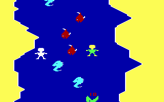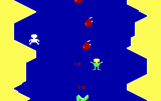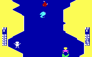 ScubaVenture drops you straight into the depths of richly detailed underwater caverns, tasking you with collecting rare fish and hunting down locked treasure chests for points. Each level is a self-contained maze of winding tunnels where you must locate the correct key before you can unlock a chest—and unlock all chests to advance. Between these objectives lurk hazards such as poisonous fish, seahorses, electric eels, and tangles of seaweed. Every contact with a dangerous creature or plant costs you one of only three precious lives, so a careful eye and quick reflexes are essential.