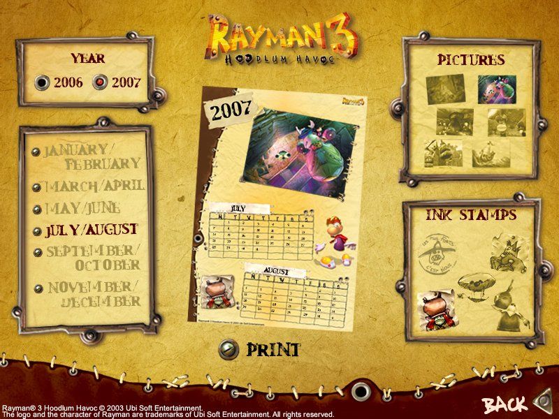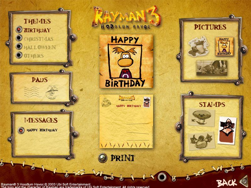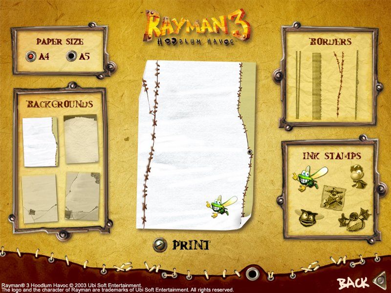 Rayman Arena’s visuals carry over the series’ signature cartoon look, but with a sportier sheen. Character models are bolder, environments more angular, and the menus sport slick UI flourishes. The fast-paced action remains free of slowdown, and the smooth frame rate helps maintain clarity during hectic multiplayer matches. Meanwhile, the Print Studio bonus option translates select in-game art into crisp, printable templates—a neat reminder of the series’ artwork quality.