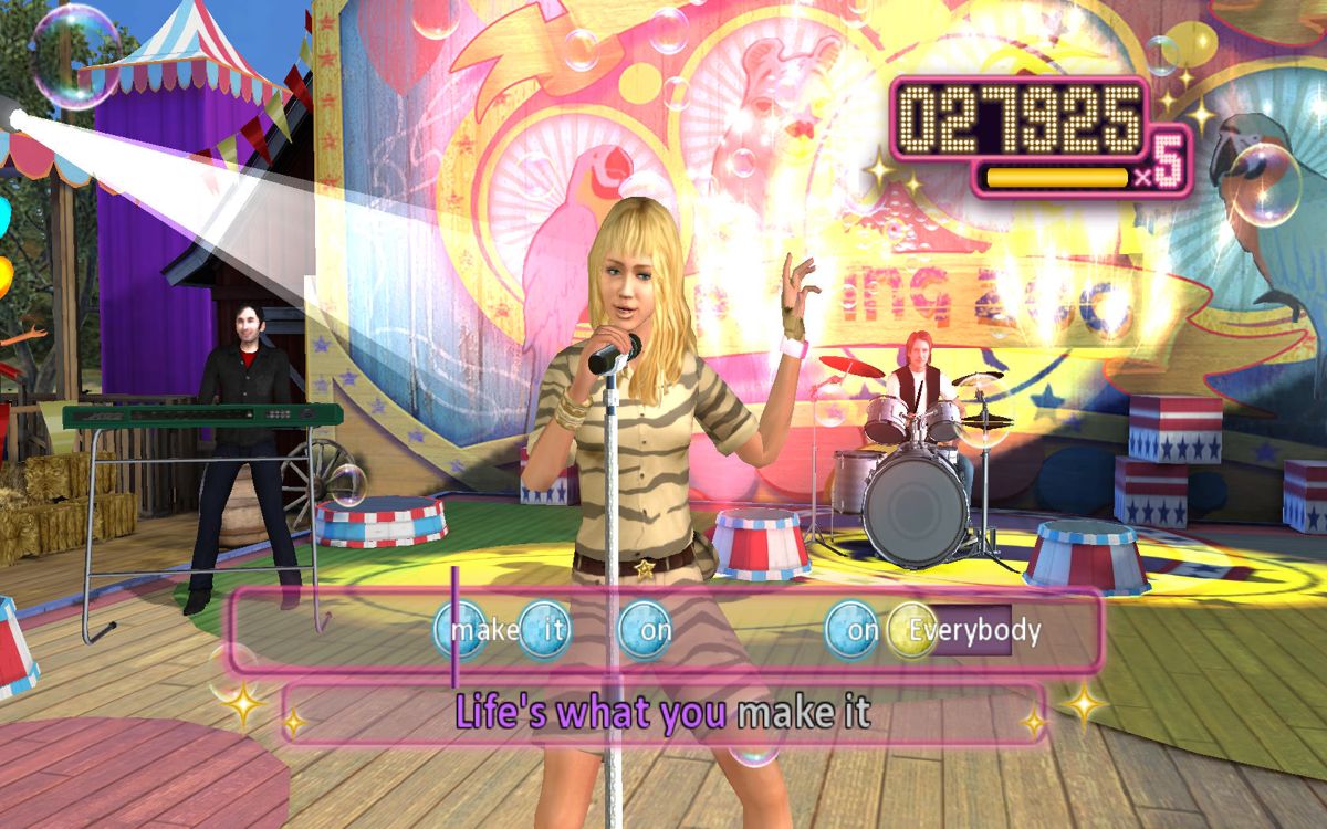Menus and UI elements lean towards clean, pop-inspired design, with clear icons for musical instruments, token counts, and customization options. The rhythm prompts are large and intuitive, ensuring accessibility for younger players or those new to music games. Overall, the graphical presentation remains consistent and engaging, reinforcing the cheerful tone that defines the Hannah Montana brand.