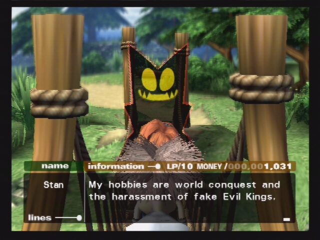 For a PlayStation 2-era title, Okage: Shadow King sports a distinctive art style that remains charming decades later. Character models are intentionally stylized—Ari looks like a typical JRPG protagonist, while Stan’s ever-changing silhouette oozes gothic whimsy. Backgrounds mix bright, pastoral towns with dark, surreal dungeons, reflecting the game’s balance of lighthearted fun and sinister undertones.