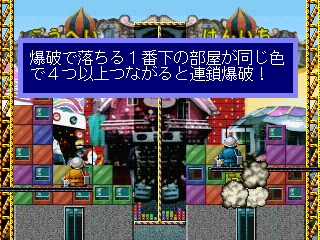 Building Crush! centers around a deceptively simple yet deep puzzle formula. You assume the role of a demolitions expert tasked with bringing down multi‐storied buildings faster than your opponent, be it the CPU or a friend in local head-to-head matches. The core mechanic involves placing bombs into “windowed” blocks—those squares highlighted with grid lines—so that when the explosive goes off, it clears any connected blocks of the same color.