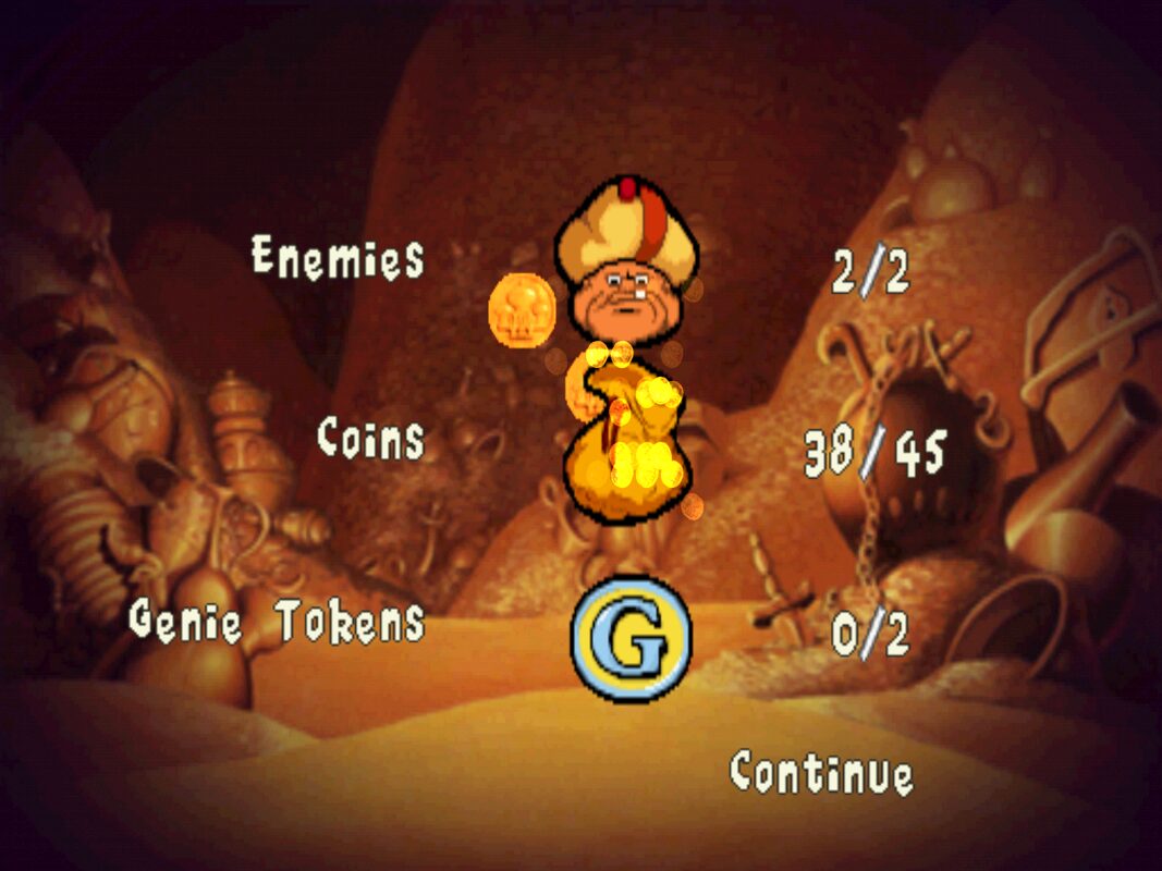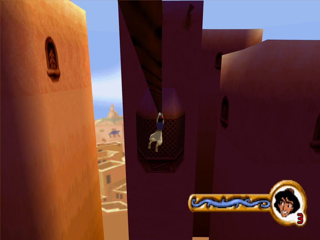 Special effects—such as the Genie’s magic, flame bursts in lava stages, or sandstorms in the desert—are executed with flair. Stage transitions are seamless, and subtle flourishes like billowing flags or drifting lanterns add atmosphere. For fans of the Disney aesthetic, the game’s visuals offer a pleasing blend of cartoon charm and early-3D polish.