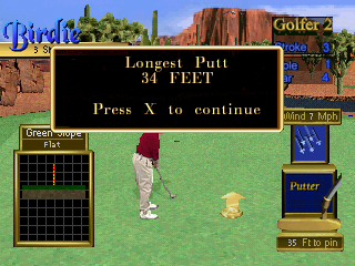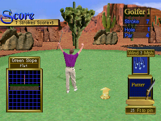 Golden Tee Golf strikes a nice compromise between arcade stylization and realistic presentation. Course environments are rendered with vibrant textures: lush fairways, reflective water hazards, and strategically placed bunkers all come to life with crisp detail. On the PlayStation, character models and course geometry hold up well, though you might notice occasional texture pop-in on more distant scenery.