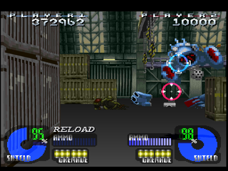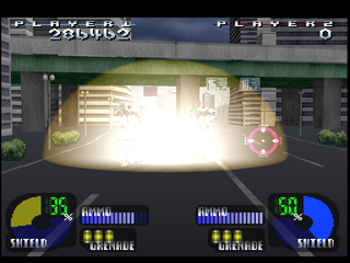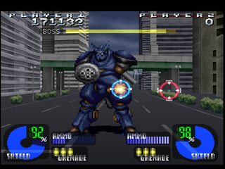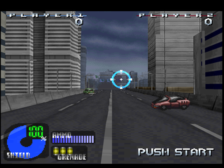 Project: Horned Owl unfolds as a classic rail-shooter, guiding players along a predetermined path as they aim and fire upon incoming threats. The game accommodates both the PlayStation mouse and the Konami light gun, offering a more immersive and tactile shooting experience. Whether you prefer the precision of the mouse or the arcade feel of the light gun, the controls remain responsive, ensuring quick target acquisition and smooth tracking through the city environments.