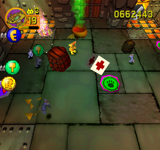 Rat Attack! delivers a unique blend of action and puzzle mechanics as you step into the paws of one of the Scratch Cats—an elite superhero team dedicated to thwarting Washington and Jefferson, two evil mutant space rats bent on global conquest. Each level challenges you to hunt down a specific number of rats using the trusty Eraticator, a vacuum-like gadget that sucks up your foes. Once caught, your next objective is to locate the Destructor pad scattered somewhere within the maze-like environments, where you must deposit your captured rats to eliminate them for good.