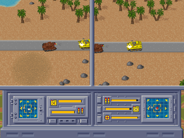 Explosions and weapon effects are punchy and satisfying, complete with colorful flashes and particle bursts that communicate impact clearly. The vehicle animations, though simple, convey momentum and weight effectively: tanks lumber forward with purpose, Jeeps skid around corners, and the helicopter swoops gracefully across the screen. When all four vehicles converge in a heated engagement, the result is a visually coherent spectacle that never descends into chaos.