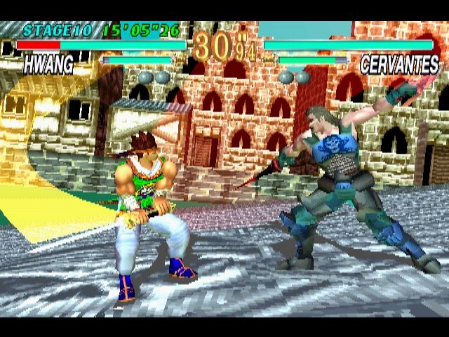 For its time, Soul Blade’s visuals were nothing short of groundbreaking. Polygonal character models are crisp, with smooth animations that bring each weapon clash to life. The fluidity of movement—especially during dramatic sidesteps and aerial combos—showcases Namco’s commitment to making a truly three-dimensional fighter that stands out in arcades and on consoles alike.