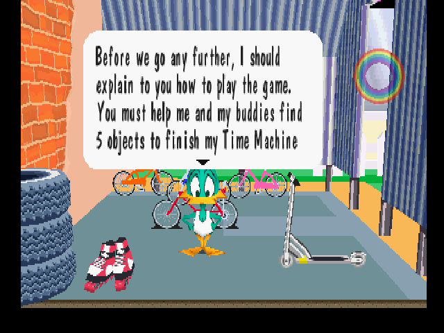 Tiny Toon Adventures: Plucky’s Big Adventure places players in the webbed feet of Plucky Duck as he embarks on a classic point-and-click style adventure. Early on, you’re tasked with collecting the scattered parts of a homemade time machine—masquerading as a bicycle—and solving light inventory-based puzzles to piece it together. The game eases you into its logic systems, ensuring that even younger players can follow along as they click around the colorful environments in search of clues and tools.