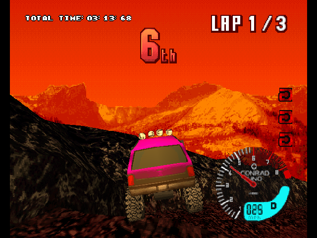 For a game built around the mid-90s racing craze, TNN Motorsports Hardcore 4×4 offers surprisingly detailed 3D environments. The courses wind through dusty desert canyons, forested trails, and murky wetland areas, each with distinct color palettes and terrain textures. Your 4×4 model reacts to bumps and jumps with convincing suspension animations, and tire tracks appear dynamically in softer ground, adding to the sense of immersion.