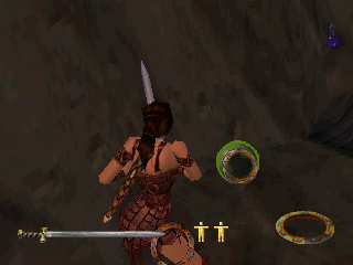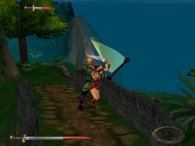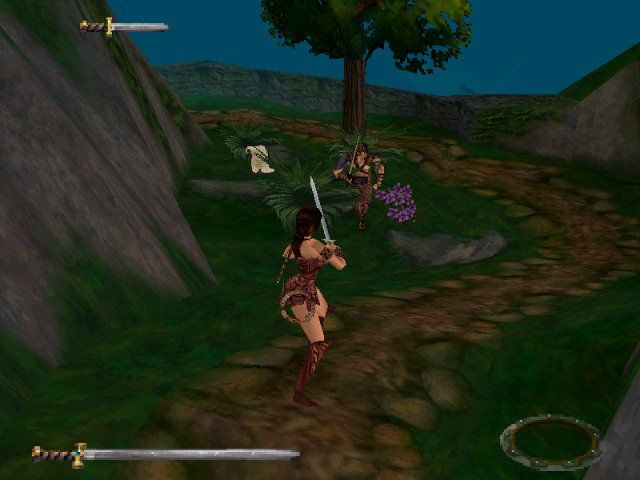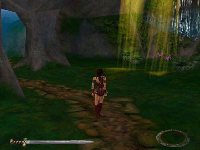 Visually, Xena: Warrior Princess captures the essence of the TV series with lush, hand-painted textures and a warm color palette that brings its ancient world to life. The character models, especially Xena herself, are impressively detailed for its era, showcasing her distinctive armor, flowing hair, and expressive face. Enemy designs also stand out, ranging from skeletal warriors to sorcerous creations of Kalabrax, each rendered with a palpable sense of menace.