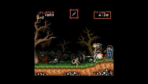 Visually, Reloaded is a mix of pixel-perfect emulations and upscaled SNES renditions. The SNES version of Super Ghouls ’n Ghosts looks surprisingly crisp on PSP’s 480×272 screen, with smooth sprite work and minimal aliasing. The arcade titles—Vulgus, SonSon, Exed Exes—retain their chunky, colorful sprites, and Capcom’s emulation team clearly took care to preserve color palettes and scanline effects, even if true scanlines aren’t present.