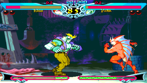 Background stages span haunted graveyards, eerie castles, and neon-lit cityscapes, each rendered in crisp, saturated color. Although the original Dreamcast assets have been downscaled slightly for the PSP, the game retains its bold art direction. Small details—like the ripple effect when playing against a water stage or the flickering torches in a dungeon backdrop—add to the mood of each fight.