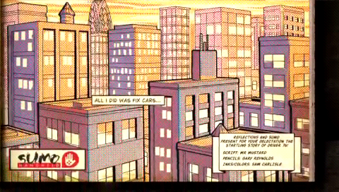 Cutscenes are presented in a stylized comic-book format, paying homage to the series’ pulp-inspired roots. Bold panel artwork, speech bubbles and onomatopoeic effects lend the narrative a graphic-novel flair, turning each mission briefing into a visually engaging mini-episode. This presentation helps mask the PSP’s screen limitations, giving each story beat a cinematic energy.