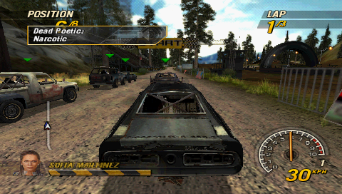 Visually, FlatOut: Head On pushes the PSP hardware further than many of its contemporaries. Tracks are densely packed with breakable props, destructible barriers, and dynamic environmental debris. While frame rates can dip during the most chaotic pileups, the overall sense of speed and destruction remains intact, and the game rarely feels sluggish. Textures aren’t as crisp as console versions, but the art style’s focus on gritty, industrial circuits and flashy dust clouds helps mask technical limitations.