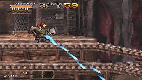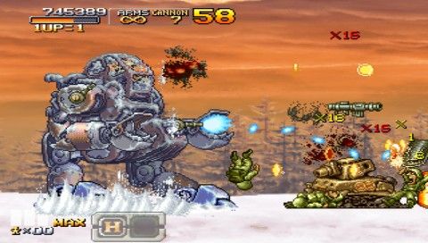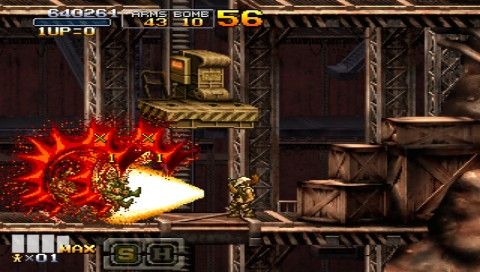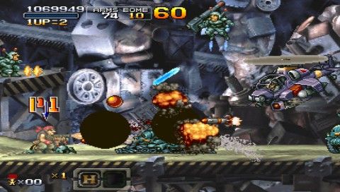 One of Metal Slug XX’s most striking features is its commitment to hand-drawn, frame-by-frame animation. Every foreground sprite and background element pops with vibrant colors and cartoonish flair, preserving the series’ distinctive visual identity. Enemy soldiers scurry in multiple frames of animation, explosions bloom in dazzling hues, and vehicles exude weight and momentum—all rendered crisply on PSP and Vita screens.