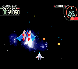 The player ship and enemies are rendered as flat-shaded polygons, which may look simple by modern standards but held their own in the era of sprite-based competition. Polygons rotate and scale smoothly, especially during boss encounters where massive vessels loom ominously. Explosions and laser beams pop with satisfying brightness against the muted video backgrounds.