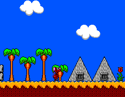 Psycho Fox sports vibrant, cartoon-inspired visuals that pop on the Sega Master System. Character sprites are crisp and colorful, giving each hero their own personality—Fox’s bright orange fur, Hippo’s pudgy frame, Leopard’s spotted coat, and Monkey Boy’s playful expression all stand out against varied backdrops. From lush forests to volcanic caverns, each world is distinct and packed with charming details like swaying plants and flickering torches.