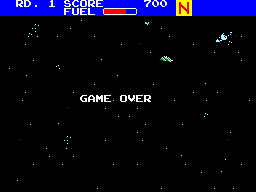The color palette leans heavily on neon blues, purples, and fiery reds, evoking a futuristic sci-fi ambiance that pairs perfectly with the space-faring theme. While individual sprites are relatively simple compared to modern standards, their clean lines and contrasty colors make each object—be it a fuel pod or an enemy fighter—instantly recognizable even amidst the visual fray.