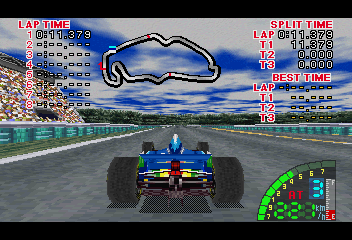 Graphically, F1 Challenge shines as one of the Saturn’s stronger 3D offerings. The polygonal car models are well-defined, with team liveries and helmet designs rendered in bright, saturated colors. While the frame rate occasionally dips during heavy on-track action, the visuals remain coherent and free of major flicker or slowdown, preserving the fast-paced excitement of Formula One.