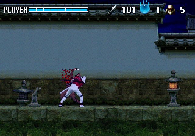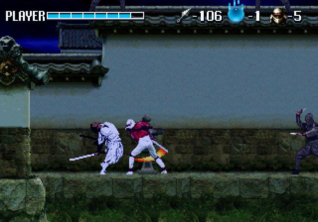 The true depth comes from the powerup system spread across nine distinct levels. Sho can unlock nearly a dozen sword techniques—such as a spinning slash that clears groups of enemies or a downward slash perfect for airborne threats—each activated by collecting glowing icons in well-placed but sometimes risky locations. Occasional “Fire Dragon” ninjutsu lets you unleash a screen-clearing attack, which proves invaluable during hectic boss encounters or when you find yourself cornered by a flood of foes.