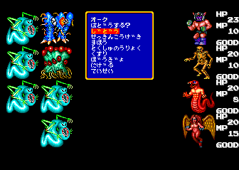 Last Armageddon places you in command of a fearsome party of demons, tasked with defending the newly christened Demon World—Makai—from an onslaught of robotic alien invaders. Battles are turn-based and viewed from a third-person perspective, evoking the classic feel of early NES-era role-playing games. Each demon in your party can perform standard attacks, cast both offensive and defensive magic, and deploy unique skills that grow more potent as they level up.