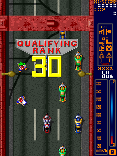 Adding to the excitement, helicopters occasionally fly overhead to drop power-ups: extra gas, turbochargers, helmets granting brief invincibility, helper motorcycles that crash into opponents, and a hefty 1,000-point bonus. Grabbing these items mid-race can mean the difference between finishing in the top ten and being left in the dust. Mastering the timing and placement of these pickups elevates Rally Bike beyond a standard racing game.