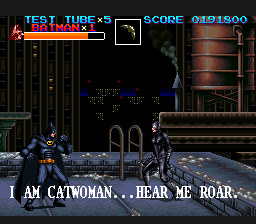 Villains are introduced in context: you’ll battle through Joker-styled circus clowns before Catwoman teases you with her whip, setting up personal showdowns that feel earned. The final clash with the Penguin atop the Gotham Cathedral matches the film’s climactic confrontation, bringing closure to both the story and your SNES adventure.