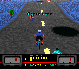 Cannondale Cup’s graphics epitomize the SNES era’s vibrant, sprite-based charm. Tracks are rendered with bold color palettes, making each environment—from sun-drenched deserts to lush forest trails—instantly recognizable. Character sprites are detailed enough to distinguish the eight racers at a glance, and animations for pedaling, punching, and landing jumps are smooth and responsive.