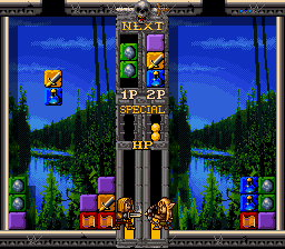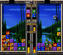 On top of that, Dossun! Ganseki Battle features a special‐attack system unlocked by lengthy chains. You can store up to three of these powerful abilities—such as clearing all Purple blocks, auto-using your potions, or wiping out the bottom three rows—in your arsenal and unleash them with the shoulder buttons. This mechanic elevates each match from a simple brawl into a chess-like mind game, where setting up your next big combo or saving your ultimate skill for a clutch moment becomes essential.