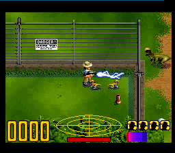 Special effects such as explosions, muzzle flashes, and computer-screen overlays demonstrate a thoughtful use of Mode 7 and other SNES capabilities. The radar display at the bottom of the screen, once powered up, features smooth oscillating sweeps that help build tension. Even ambient details—like the sway of overhead lights or the flicker of a malfunctioning monitor—add to the sense that Jurassic Park is a living, malfunctioning world.