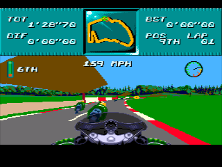 Graphically, Kawasaki Superbike Challenge takes a clear step up from its F1 counterpart by populating its environments with more polygonal roadside objects—barriers, spectators, and trackside billboards all contribute to an immersive sense of speed. While the bikes themselves are modeled with a modest polygon count, Kawasaki’s official license ensures each fairing, decal, and exhaust port looks the part.