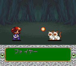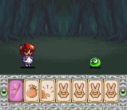 Combat is driven entirely by magic; Arle cannot perform physical attacks, so mastering her spellbook is essential. Random encounters trigger a side-view battle screen where Arle appears on the left and her whimsical foes on the right. With no visible health bars or numerical indicators for hit points, battles hinge on intuition, timing, and pattern recognition—forcing you to learn enemy behaviors and adjust your strategy on the fly.