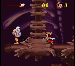 Pinocchio’s gameplay embraces the classic mechanics of a Disney platformer, offering simple yet satisfying controls. You’ll guide Pinocchio through a variety of environments, from the quaint streets of the village to the dark, churning interior of Monstro the whale. Running, jumping, and that memorable twist-kick move feel responsive and intuitive, making it easy for players of all ages to pick up and play.