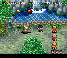 Pocky & Rocky 2 showcases some of the finest sprite work on the SNES, with characters and enemies rendered in crisp, colorful detail. Pocky’s flowing robes and Rocky’s fur tufts animate smoothly, giving life to every leap, spin, and magical attack. Background environments—from blossoming cherry groves to shadowy demon lairs—are richly textured, blending pixel art charm with a subtle, almost watercolor aesthetic.