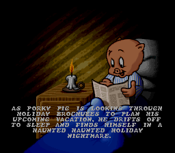 On its original system, Porky Pig’s Haunted Holiday uses a charming pixel art style that captures the zany spirit of the Looney Tunes universe. Backgrounds are richly detailed, with flickering lanterns in the haunted woods and cobweb‐lined corridors of the ghostly mansion. Each environment has its own color palette and visual motifs, ensuring that you never feel like you’re running through the same scene twice.