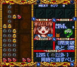 At its core, Super Nazo Puyo: Rulue no Roux takes the familiar color-matching puzzle action of the Puyo Puyo series and embeds it within a light RPG framework. Rather than competing head-to-head against AI or human opponents, each puzzle encounter is presented as a self-contained scenario with a distinct objective—clear only red Puyos, execute a three-step chain in under 20 seconds, or eliminate all garbage Puyos before time runs out. This design injects fresh variety into the formula and shifts the focus from competitive duels to strategic problem-solving.
