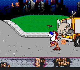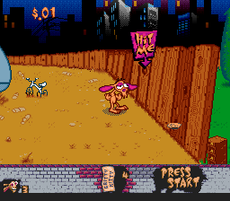 Time Warp’s plot is a simple but effective premise: Ren and Stimpy must chase their hero, Muddy Mudskipper, through time to stop him from rewriting history and throwing space and time into chaos. This setup provides a loose narrative thread to tie together the game’s varied levels, justifying everything from backyard scuffles to interdimensional space battles.