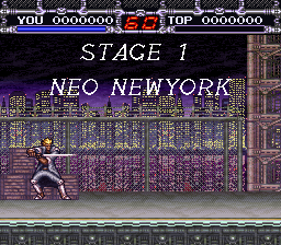 The visual presentation of X-Kaliber 2097 channels a gritty cyberpunk atmosphere set in a decaying Neo N.Y. Streets glow with neon signs while crumbling skyscrapers loom in the distance, creating a striking backdrop for the chaos below. Character sprites are richly detailed, and the motion frames for Slash’s sword slashes and enemy transformations are impressively fluid for its era.